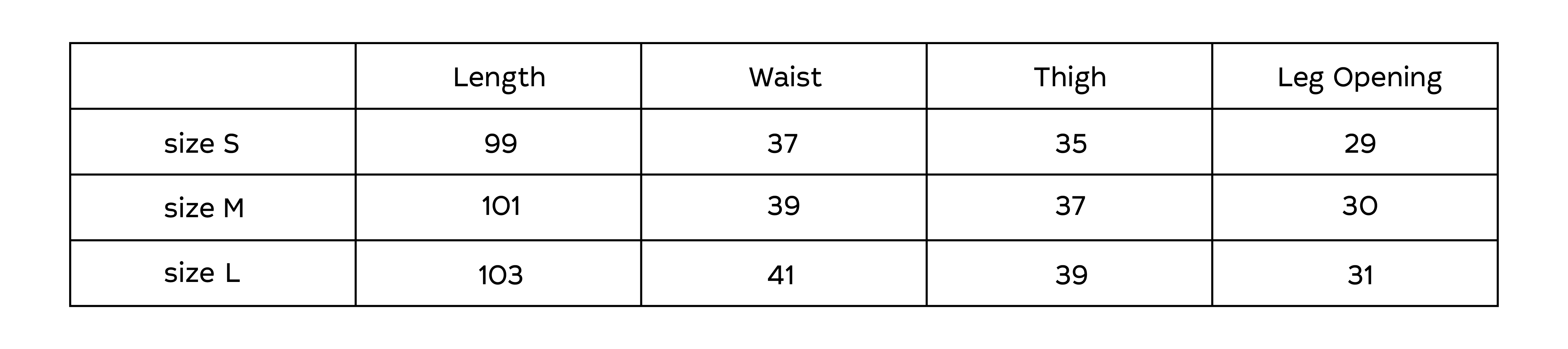 M: Length 101cm / Waist 39cm / Thigh 37cm / Leg Opening 30cm