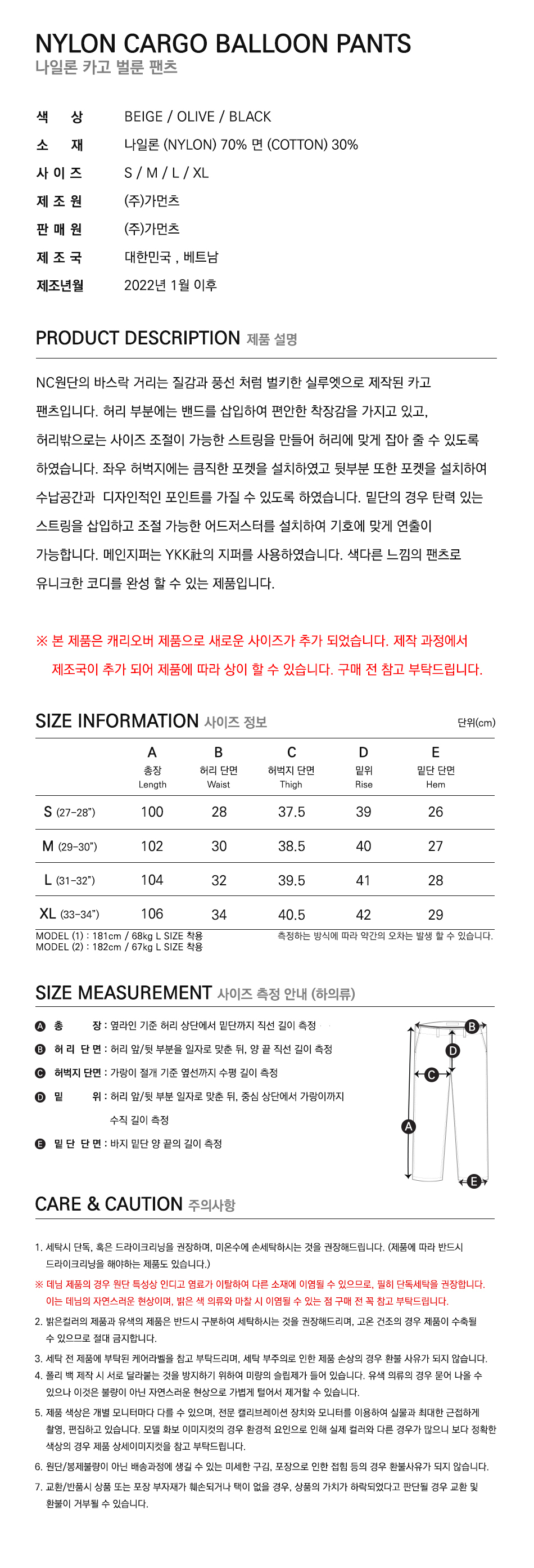 It is a cargo pant made with the crunchy texture of NC fabric and a silhouette that is bulky like a balloon. .A band is inserted in the waist to have a comfortable fit, and a size-adjustable string is made outside the waist to fit the waist. Large pockets are installed on the left and right thighs, and pockets are also installed on the back to provide storage space and design points. In the case of the hem, you can insert an elastic string and install an adjustable adjuster to suit your taste. The main zipper is YKK's zipper. It is a product that can complete a unique coordination with pants with a different feeling.