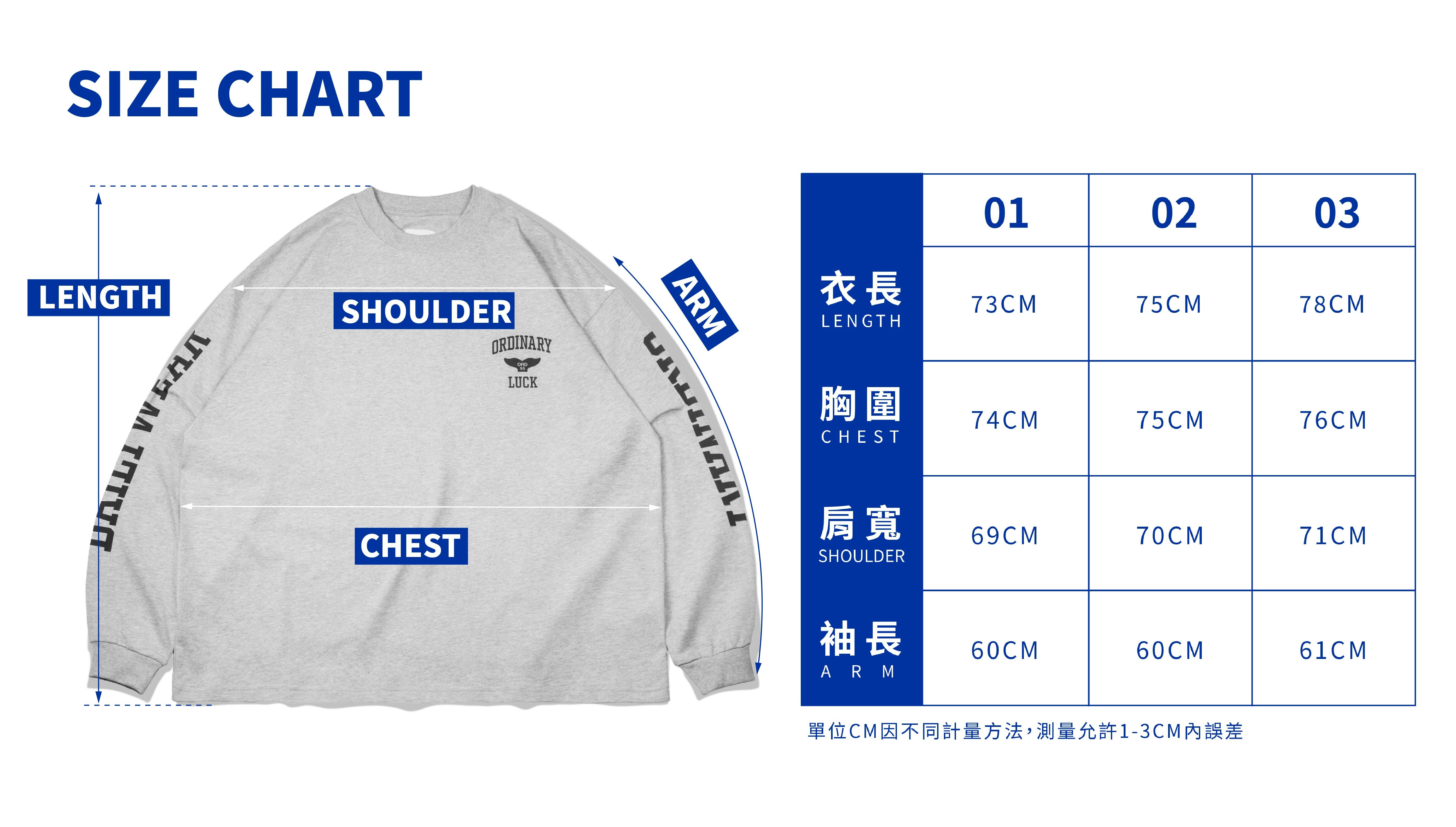 01:衣長73cm / 胸寬74cm / 肩寬69cm / 袖長60cm