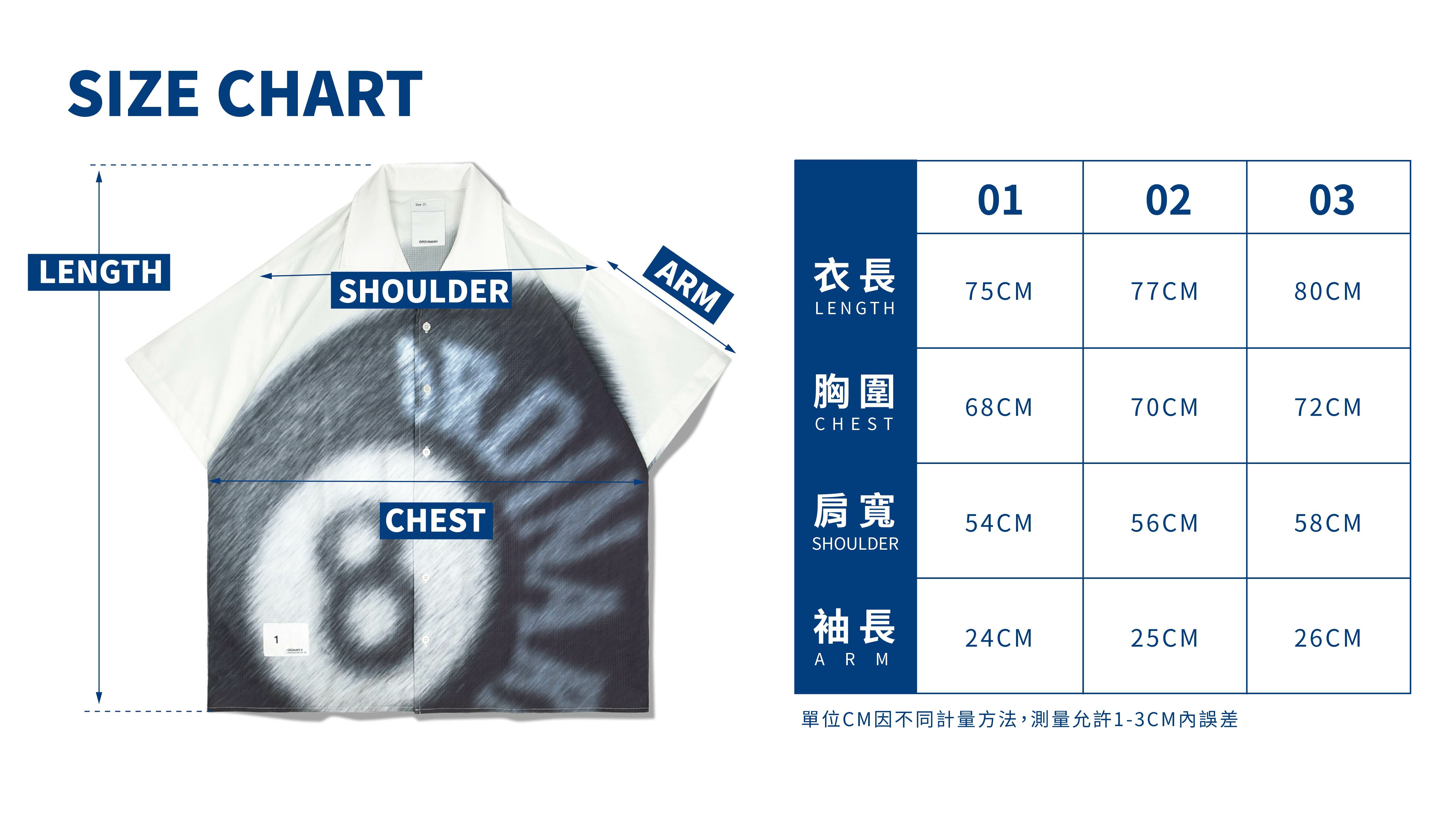 01:衣長75cm / 胸寬68cm / 肩寬54cm / 袖長24cm