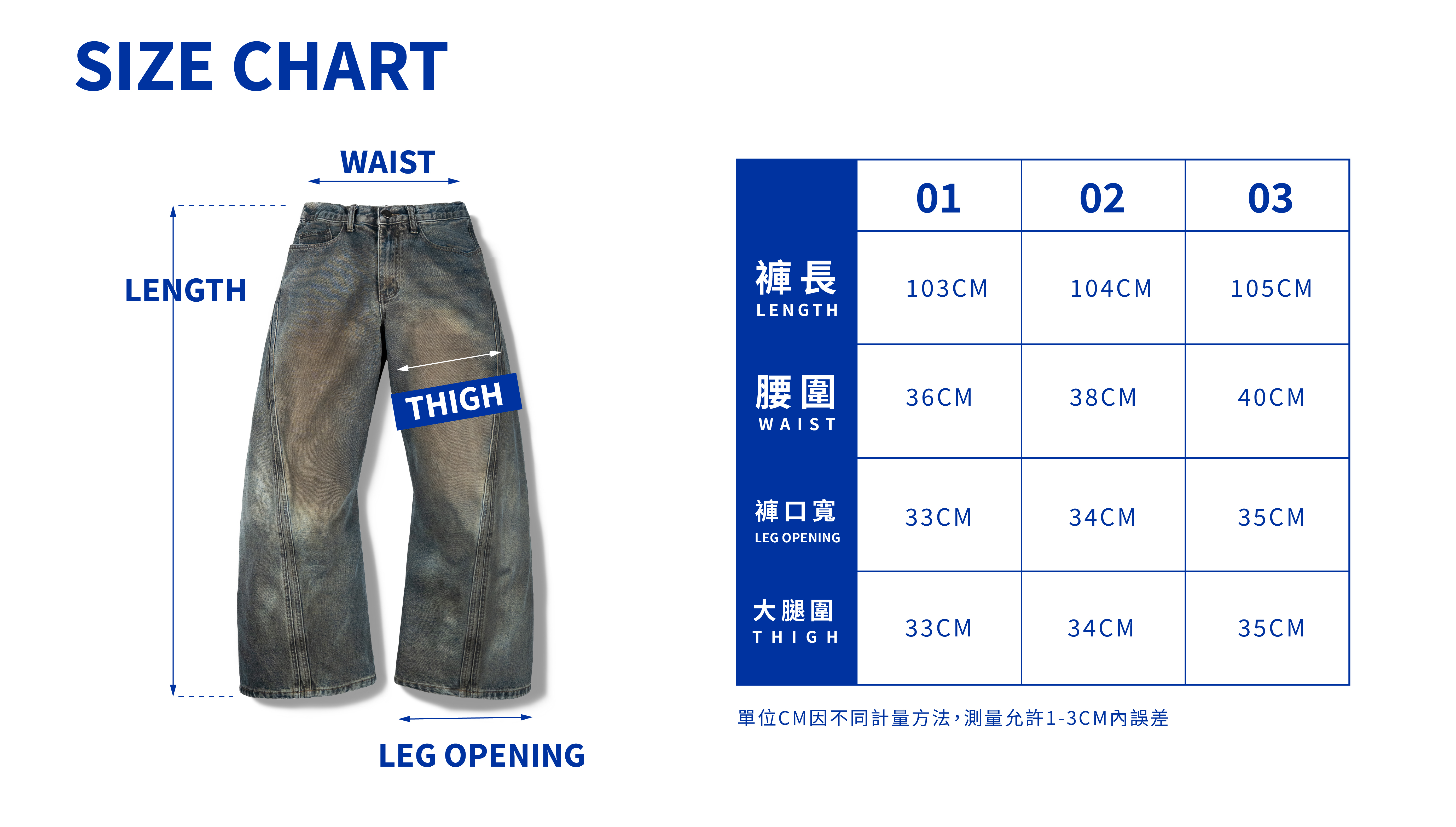 01:褲長103cm/腰圍36cm/大腿圍33cm/褲口寬33cm