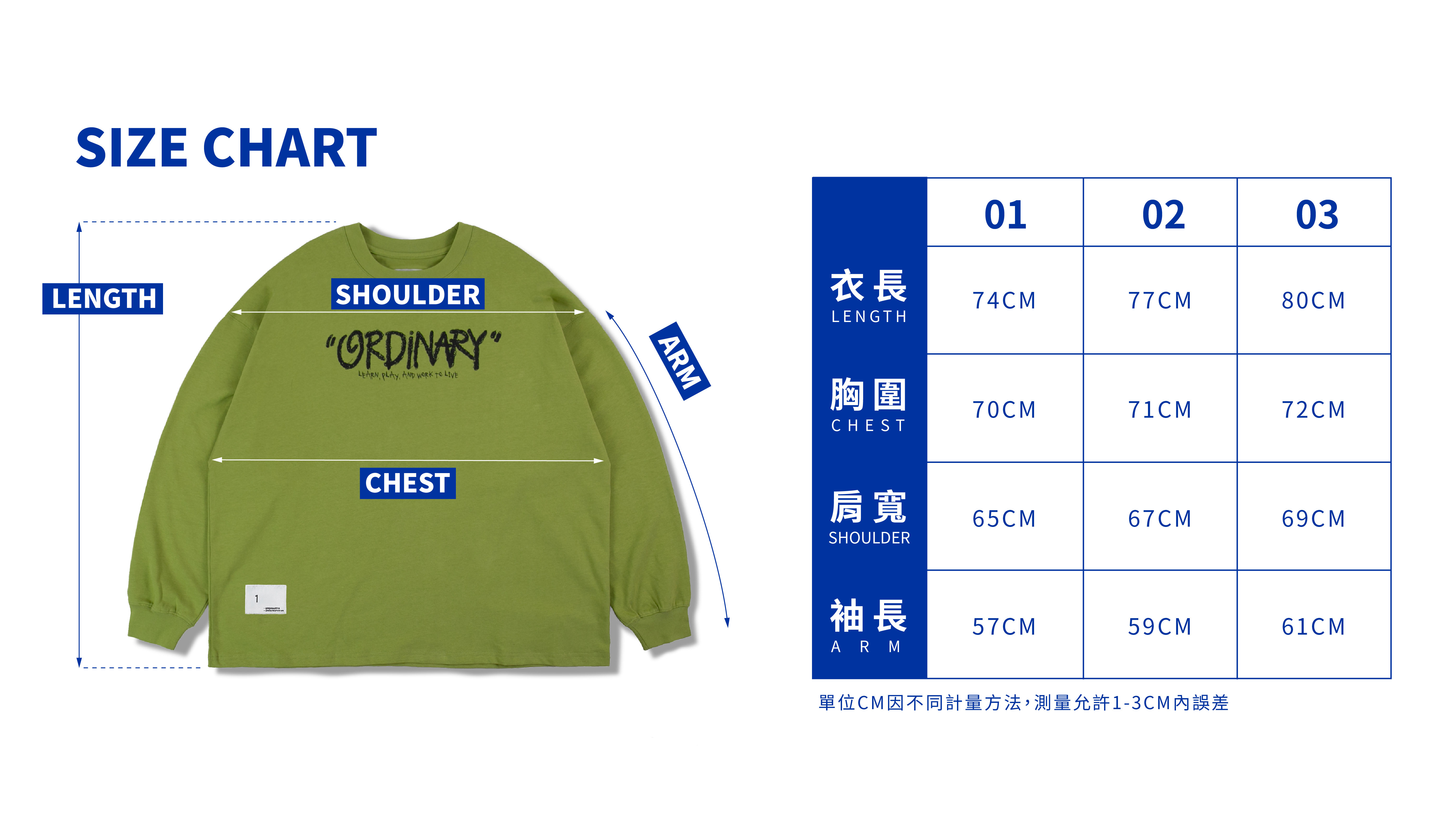 01:衣長74cm / 胸寬70cm / 肩寬65cm / 袖長57cm