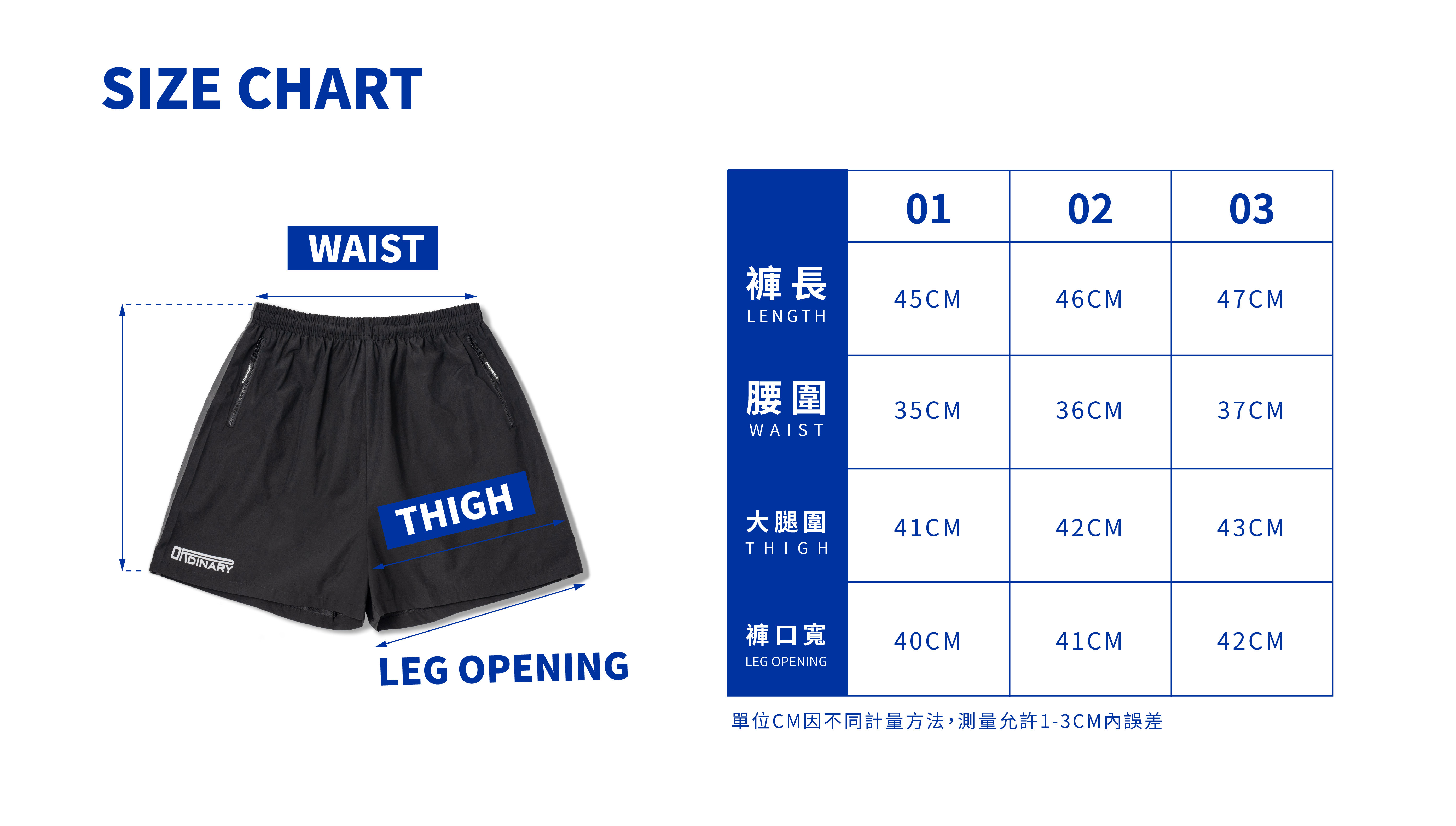 01 : 褲長45cm / 褲口40cm / 腰圍35cm/ 大腿寬41cm