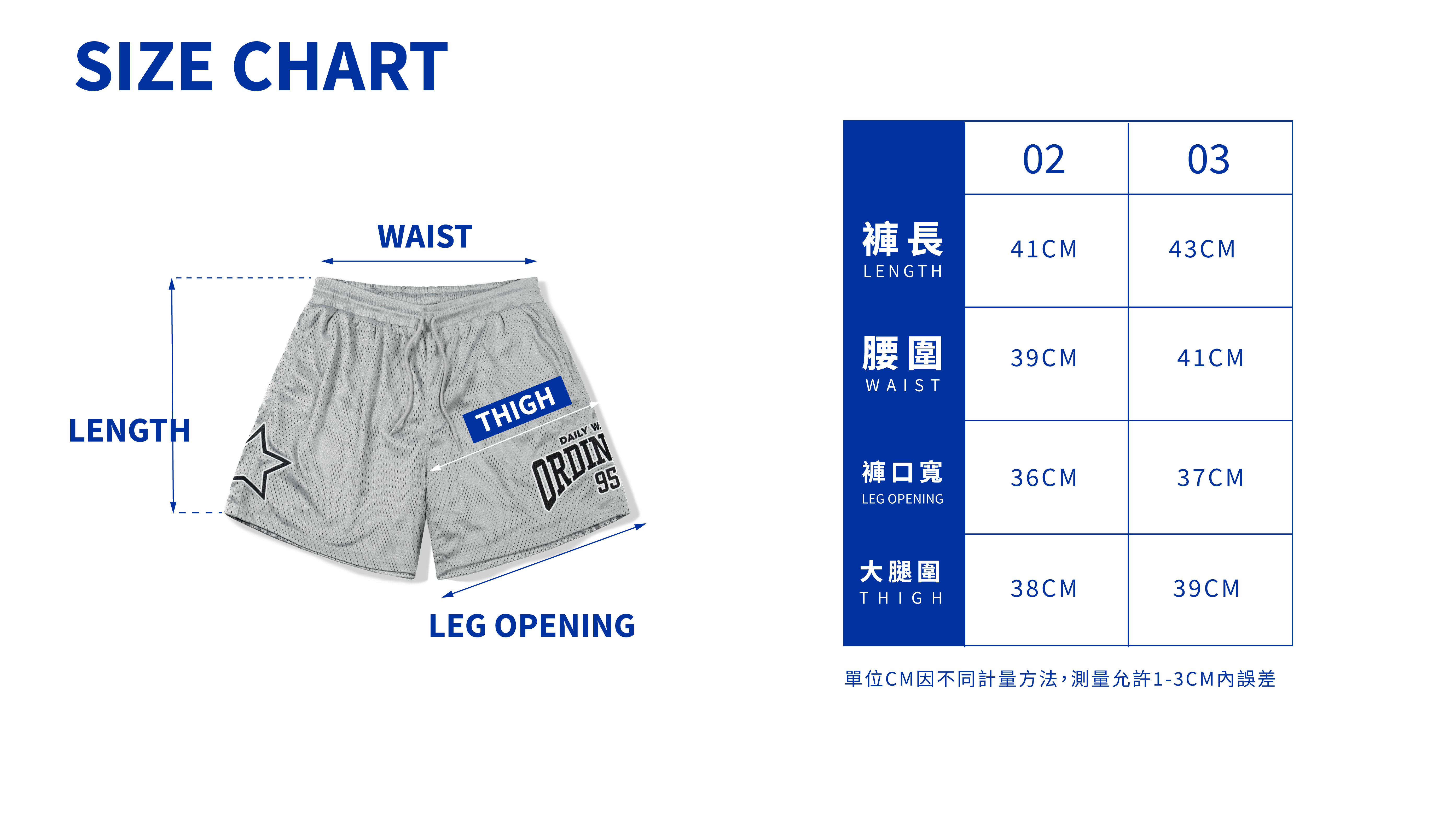 02 : 褲長41cm/腰圍39cm/大腿寬38cm/褲口36cm
