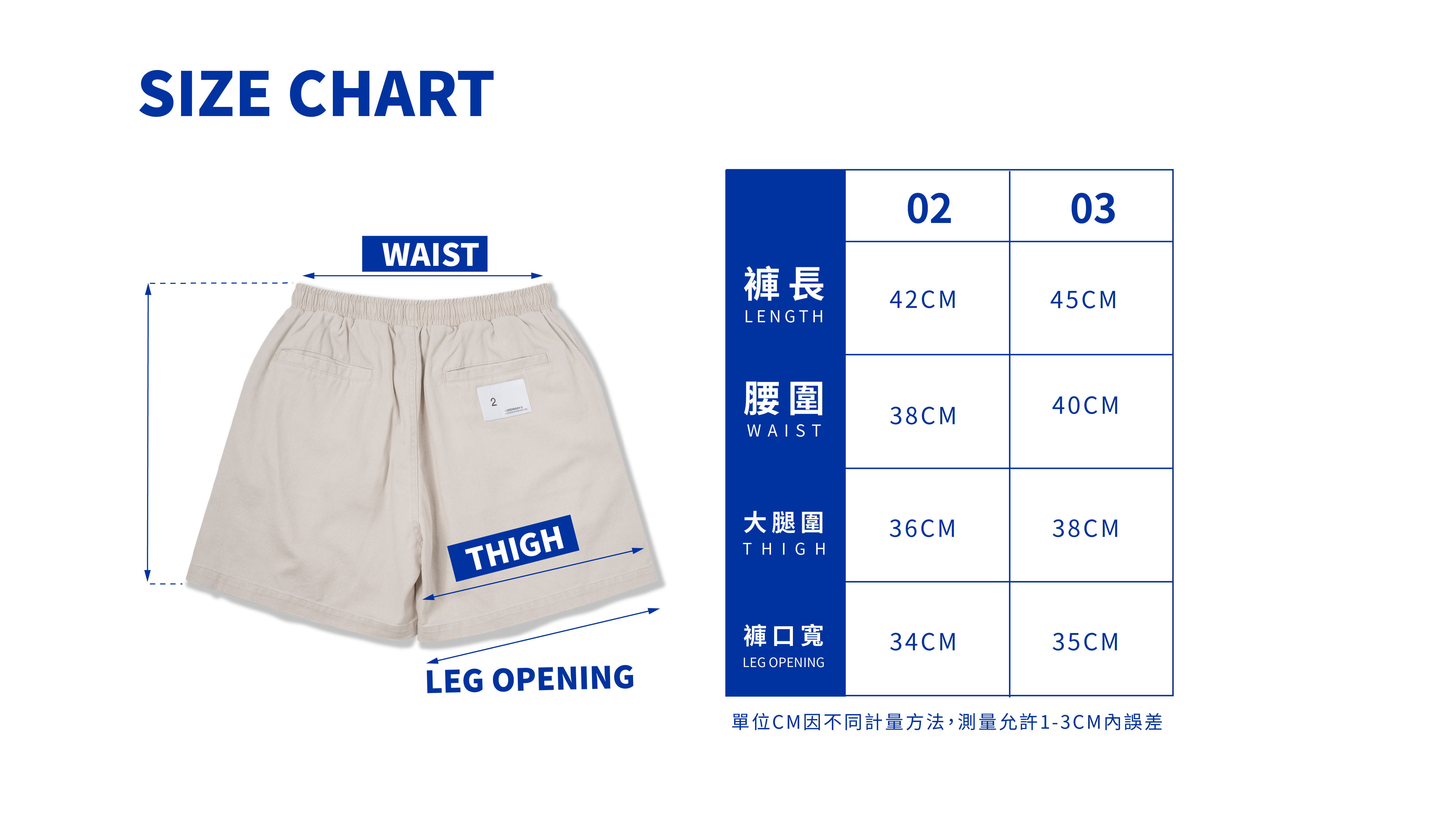 03: 褲長45cm / 腰圍40cm(鬆緊腰頭34~38腰) / 大腿圍38cm / 褲口寬35cm