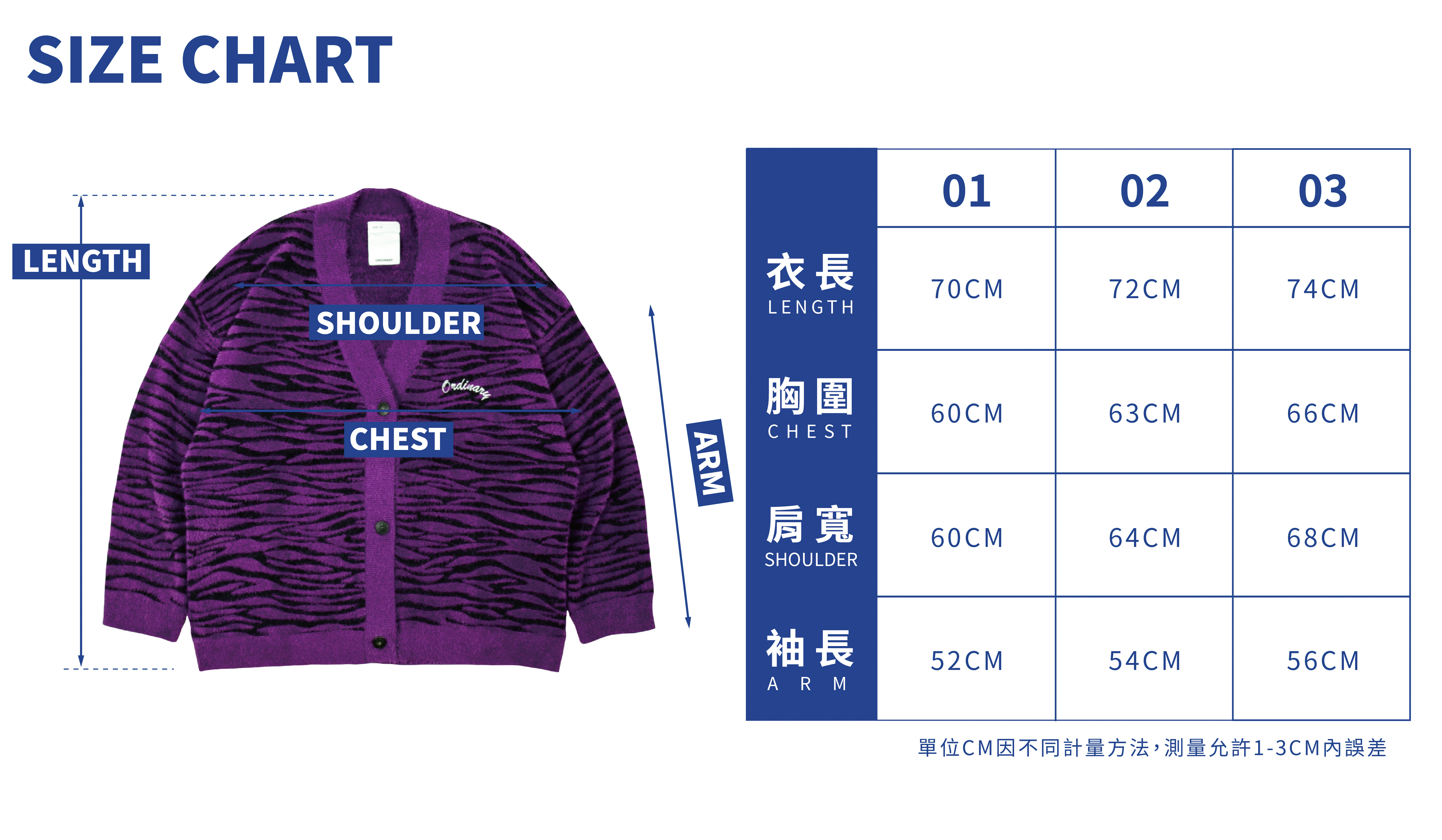 01:衣長74cm / 胸寬68cm / 肩寬64cm / 袖長56cm