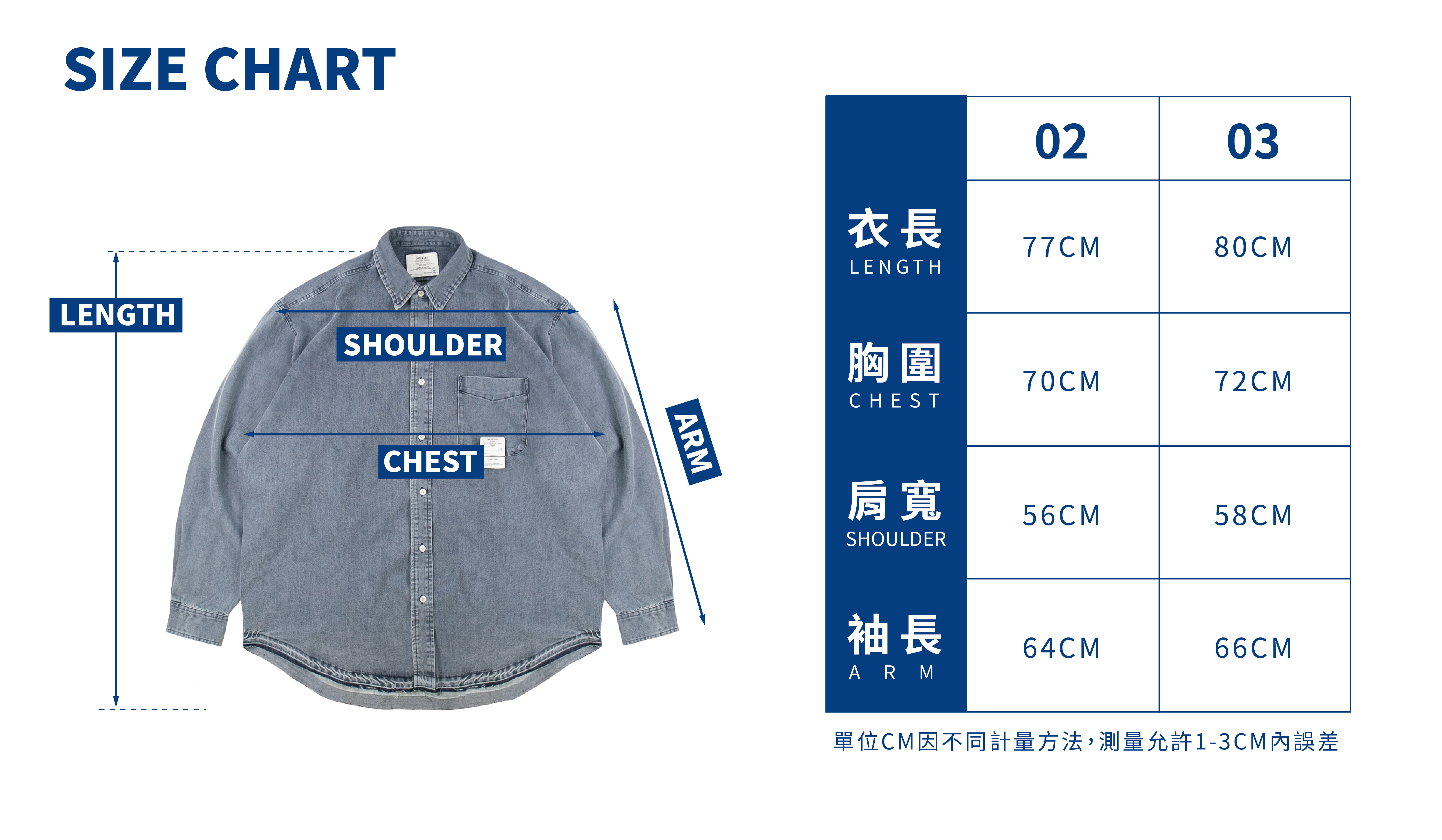 02:衣長77cm / 胸寬70cm / 肩寬56cm / 袖長64cm