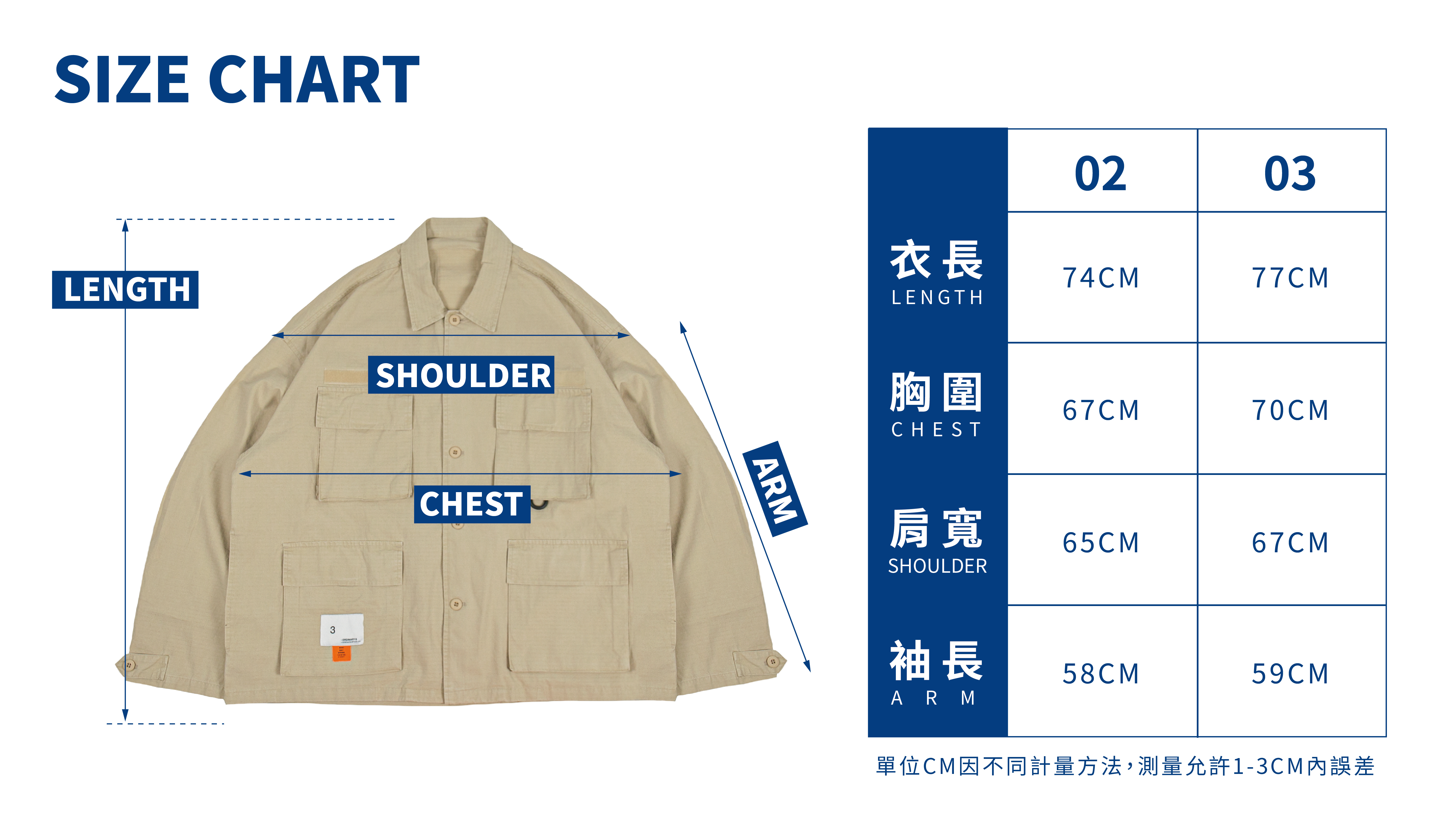 03:衣長77cm / 胸寬70cm / 肩寬67cm / 袖長59cm