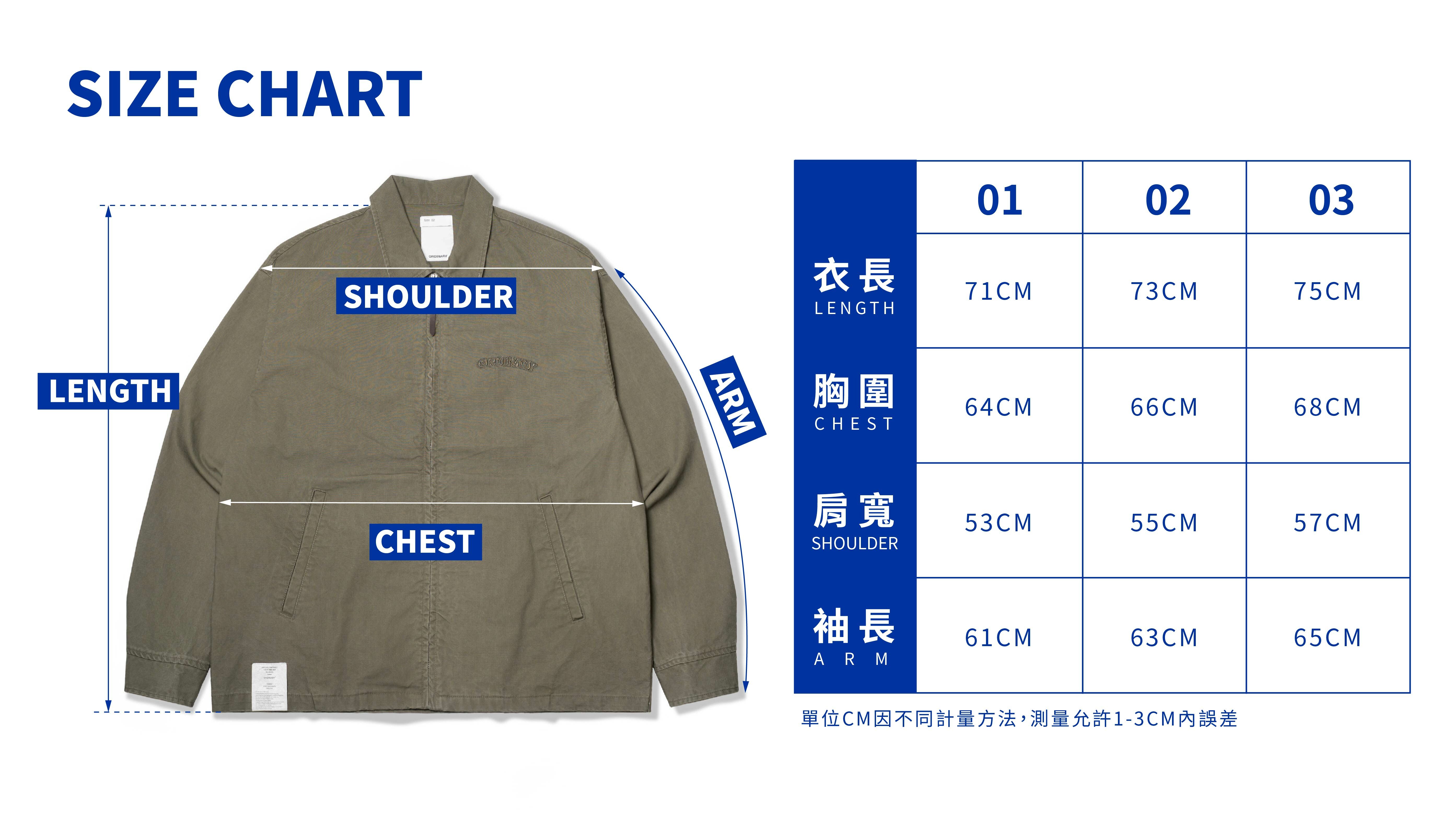 01:衣長71cm / 胸寬64cm / 肩寬53cm / 袖長61cm