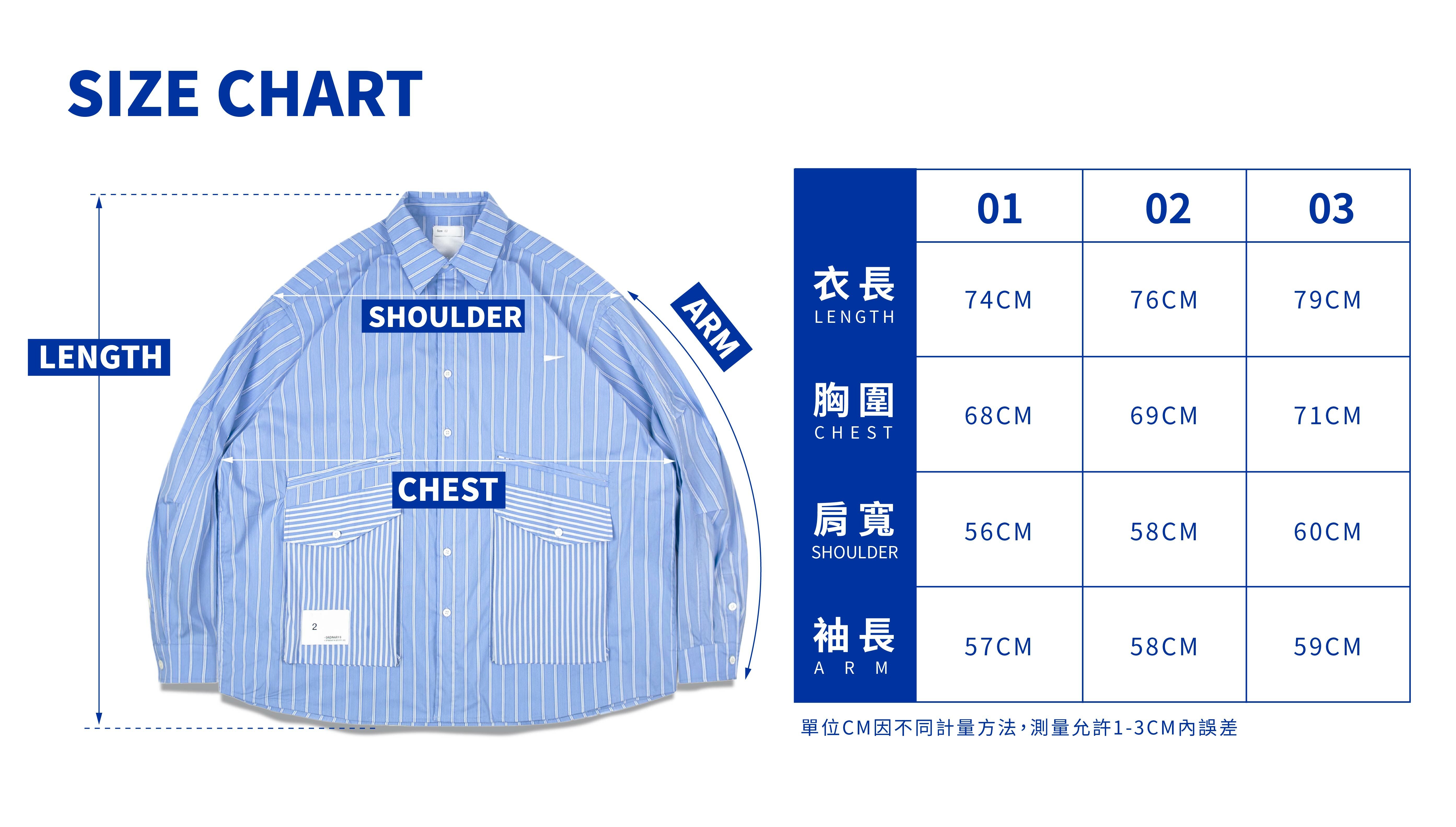 01:衣長74cm / 胸寬68cm / 肩寬56cm / 袖長57cm