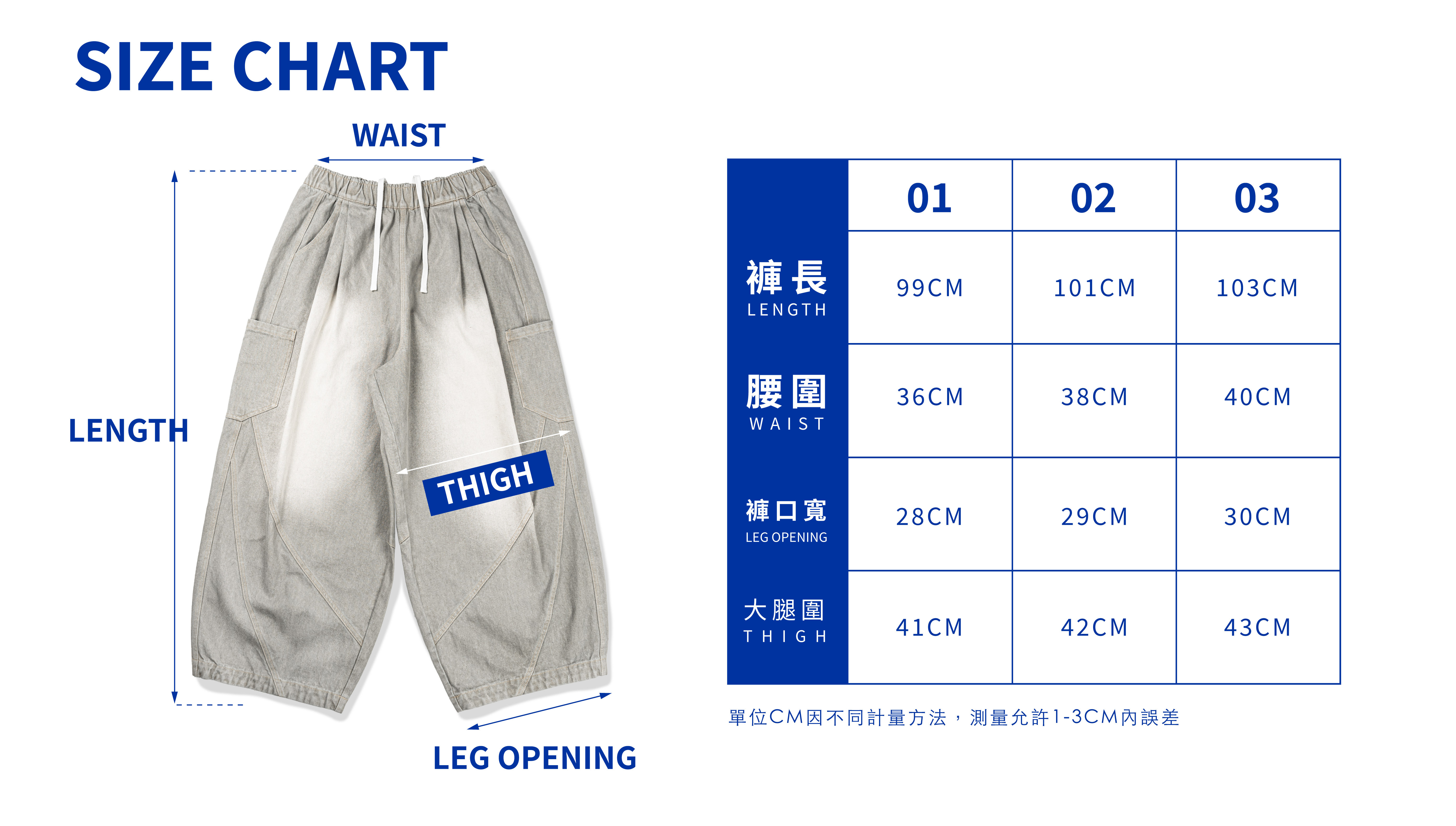 01 : 褲長99cm/腰圍36cm/大腿寬41cm/褲口28cm