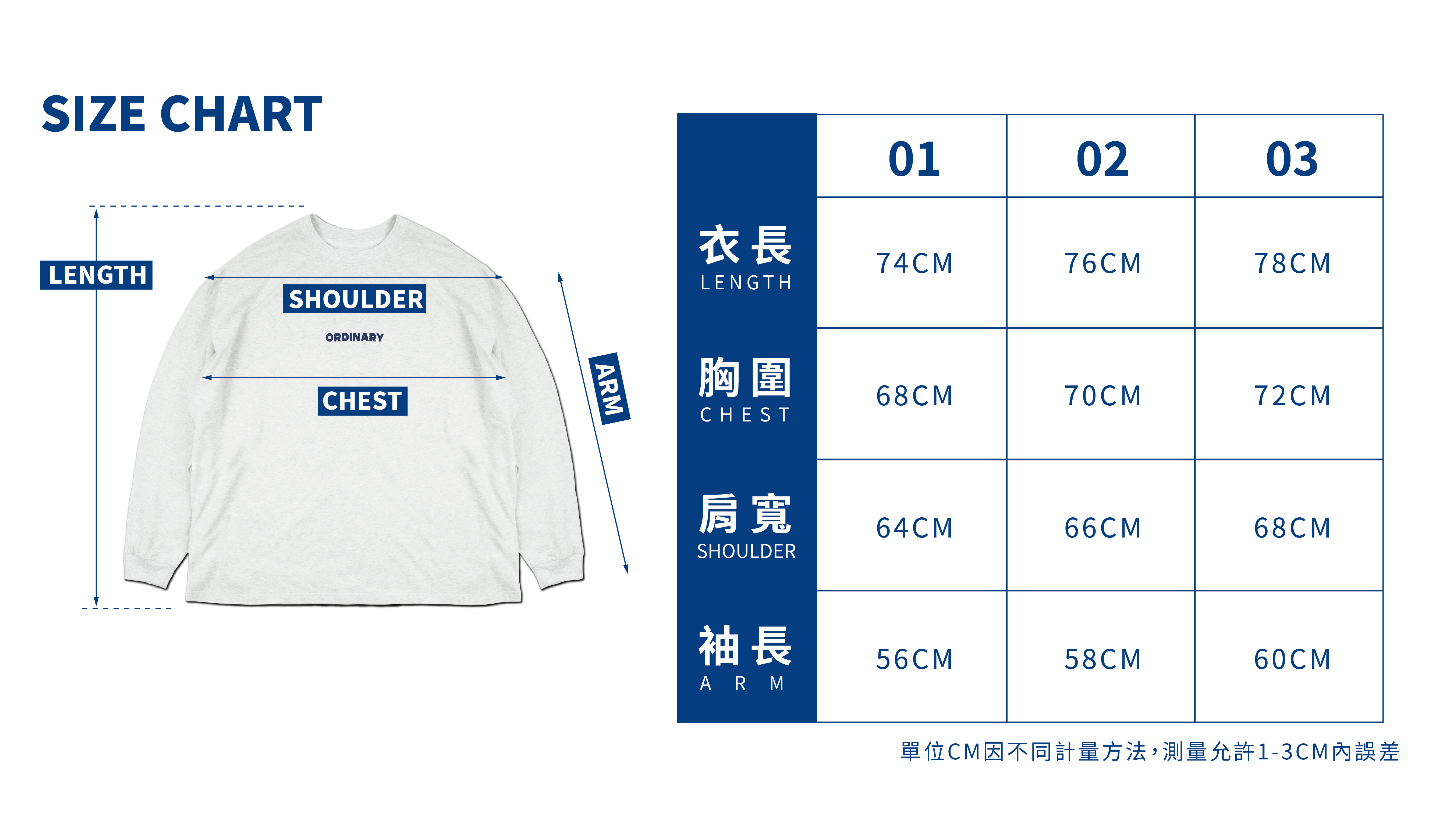 02:衣長74cm / 胸寬68cm / 肩寬64cm / 袖長56cm
