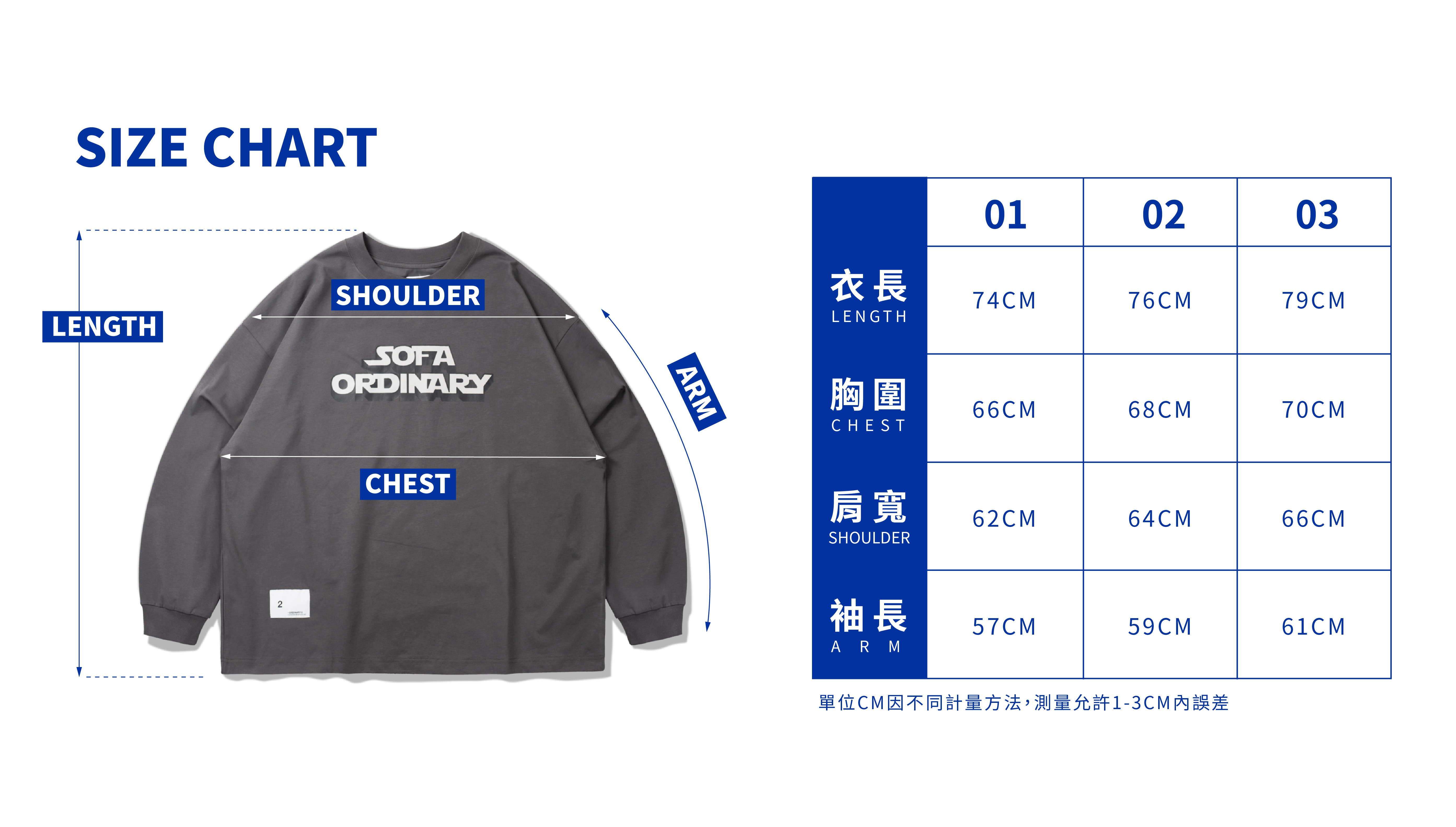 01:衣長74cm / 胸寬66cm / 肩寬62cm / 袖長57cm